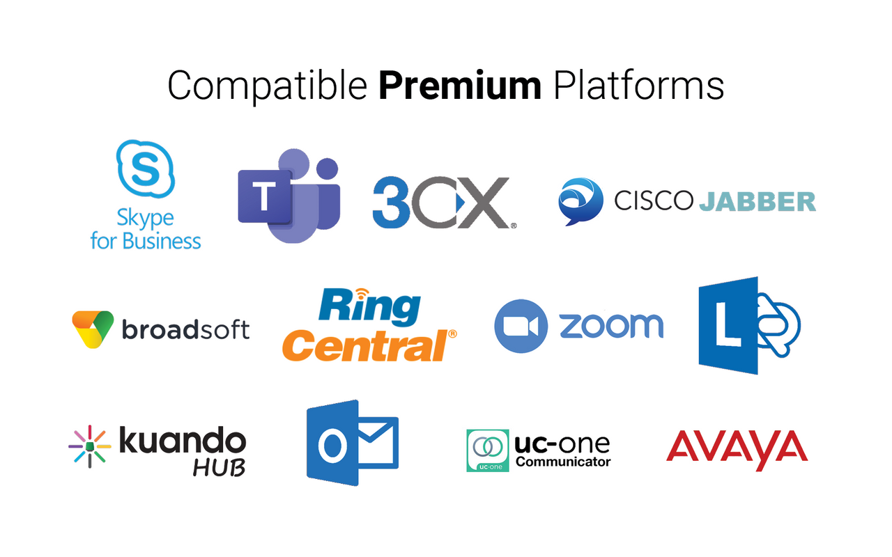 Samhæfni við hugbúnað: Tækið samstillist yfir 90 UC-kerfum, þar á meðal Microsoft Teams, Zoom, Cisco Webex, Skype for Business og RingCentral.